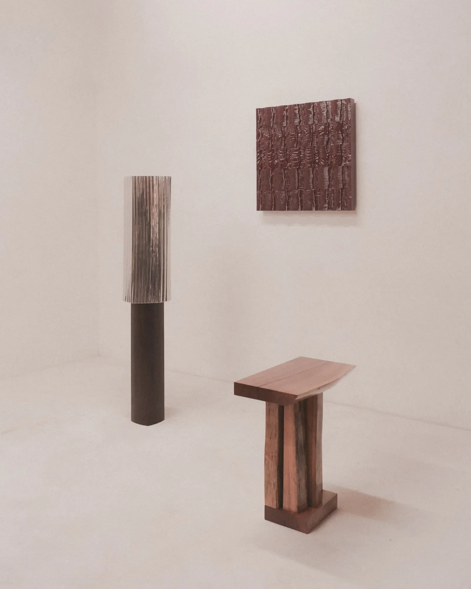 L'installazione è costruita in due atti dichiarati: il visitatore entra prima in un backstage in cui la struttura architettonica è deliberatamente esposta, pareti non finite, elementi grezzi, mobili presentati come oggetti autonomi in quella zona sospesa tra prototipo e opera compiuta, e solo dopo accede all'interno vero e proprio, alla stanza finita, alla garçonnière come ambiente atmosferico definito da elementi architettonici morbidi in tessuto teso che addolciscono la geometria rigida dello spazio. Questa sequenza non è un vezzo curatoriale, è una presa di posizione: il progetto di interni viene dichiarato come costruzione consapevole, come messa in scena di cui si mostrano le quinte, non come naturalizzazione di un'estetica che finge di preesistere al gesto progettuale. Il riferimento dichiarato è il fumoir "Les Palmiers" di Jean Dunand, e anche qui la citazione non è decorativa ma genealogica, perché colloca il progetto dentro una linea precisa che attraversa l'Art Déco delle stanze-rifugio degli anni Venti, quella cultura dell'interno come ambiente totale in cui ogni elemento partecipa a una composizione atmosferica coerente e in cui il lusso non è ostentazione ma densità sensoriale. I pezzi in mostra costruiscono questa densità senza indulgervi: i tavoli Kura in rovere massello modificato e laccato, le lampade Curoso II in alluminio fuso, mogano e cristallo di rocca, il daybed in pino dell'Oregon e seta, i wall pieces della serie Composition, il tappeto custom in lana neozelandese.