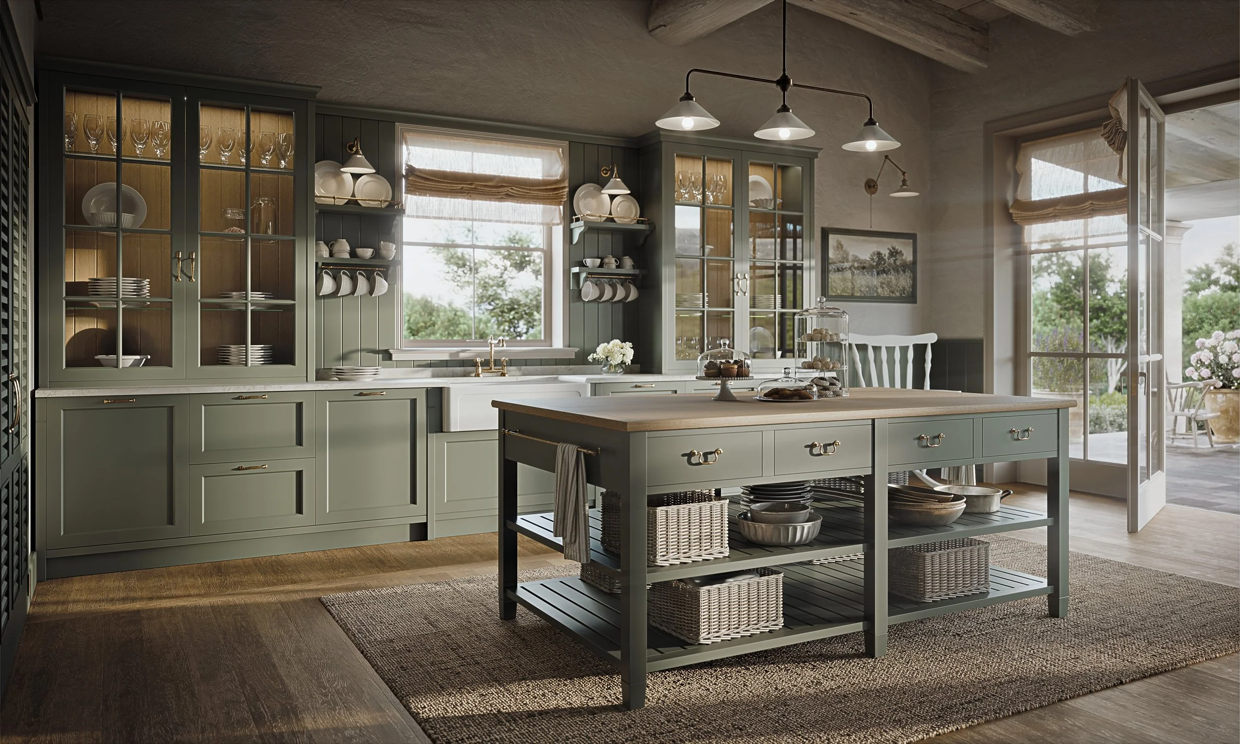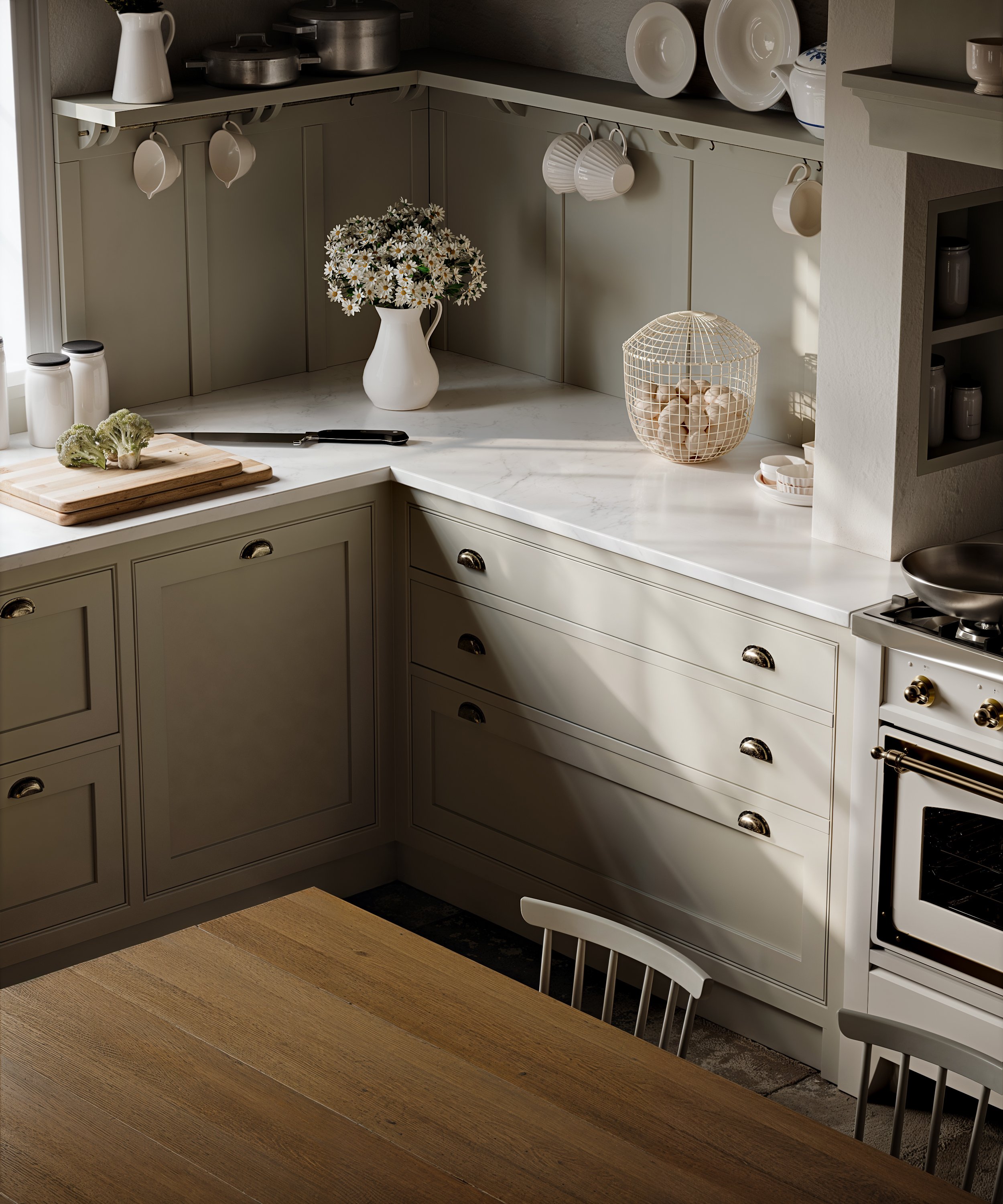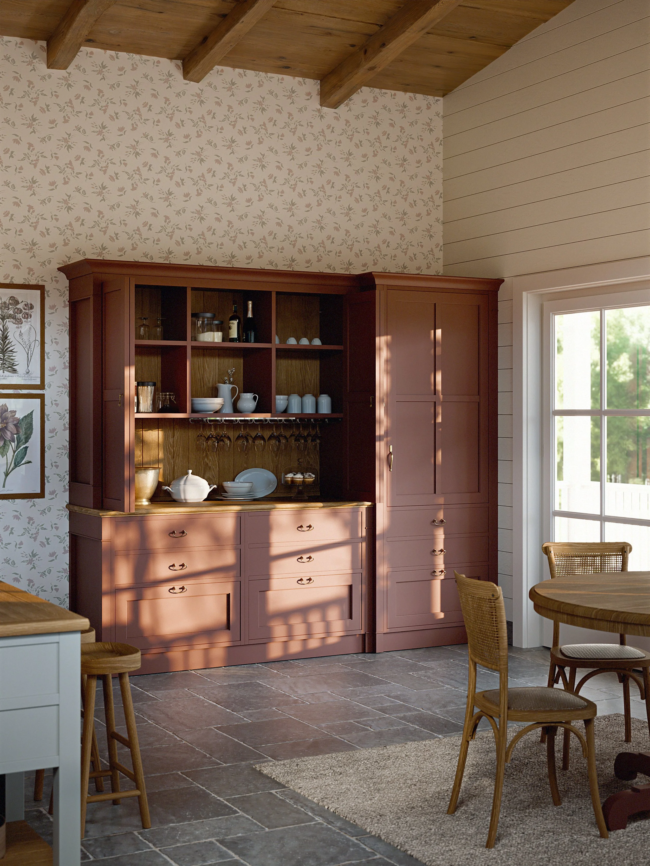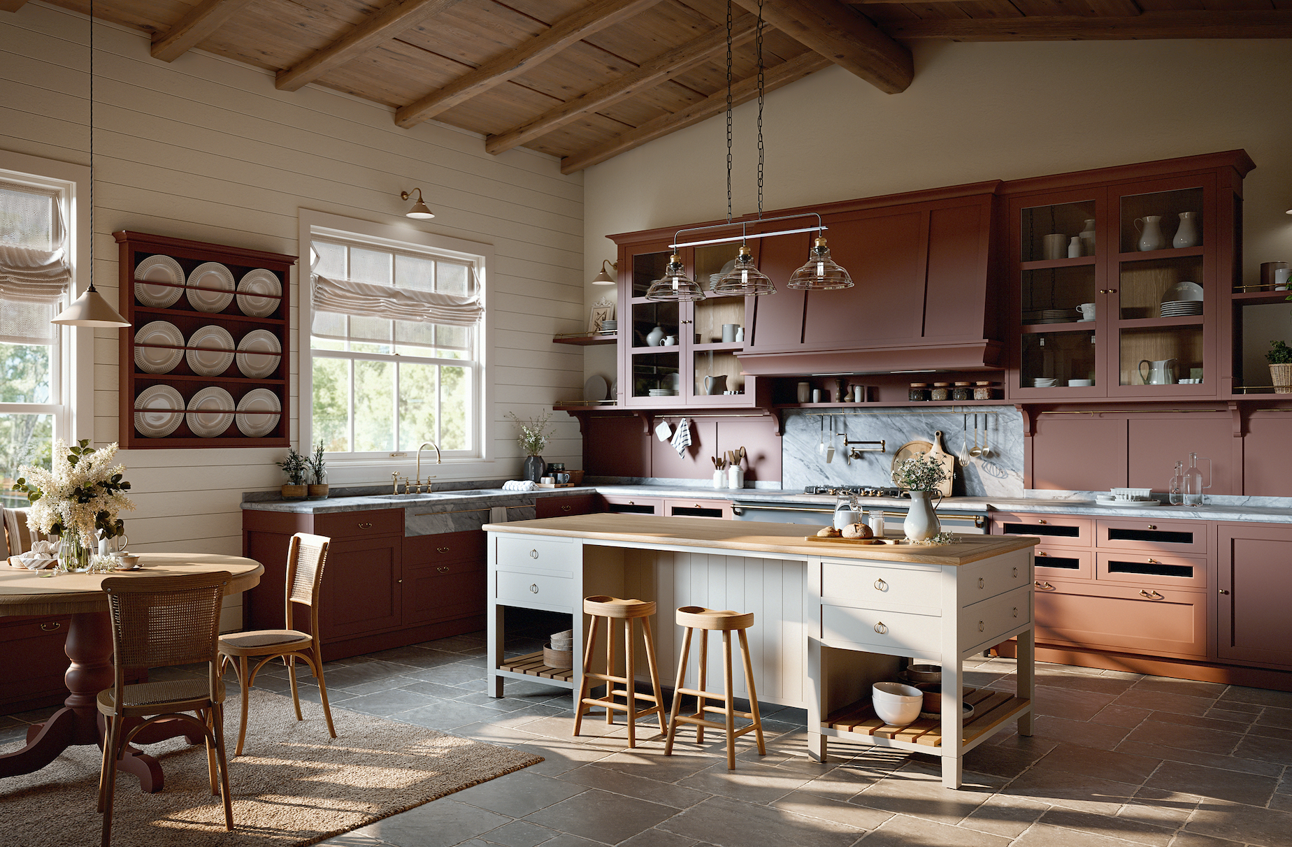 Adalise non è sola. La collezione Cottage si completa con altri due modelli che condividono la stessa filosofia ma hanno caratteri propri, altrettanto definiti. Alma Rose lavora su un registro sofisticato e avvolgente. Le maniglie in ottone brunito e la cappa con finiture in ottone costruiscono un linguaggio visivo preciso, caldo senza essere ridondante. Il banco di lavoro centrale, laccato con piano in legno, diventa il fulcro di una cucina pensata per chi ama cucinare e condividere. La grande dispensa integrata risolve tutta la parte funzionale con la stessa eleganza dell'esterno: ampi spazi contenitivi, soluzioni pratiche, tutto nascosto dentro un involucro coerente. È una cucina che sa esattamente cosa vuole essere. Agatha punta tutto sulla convivialità. Il grande tavolo in rovere e la panca introducono una dimensione domestica che non è mai solo estetica, è un invito a stare. La credenza laccata con ripiani regolabili in legno e cremagliere a vista organizza lo spazio con un equilibrio che ricorda certi interni di campagna inglese. La dispensa Mudroom, con i suoi ampi volumi contenitivi e l'area appendiabiti integrata, è il dettaglio che trasforma Agatha da cucina a stanza vissuta. Il tipo di ambiente in cui ci si ferma anche quando non si sta cucinando.