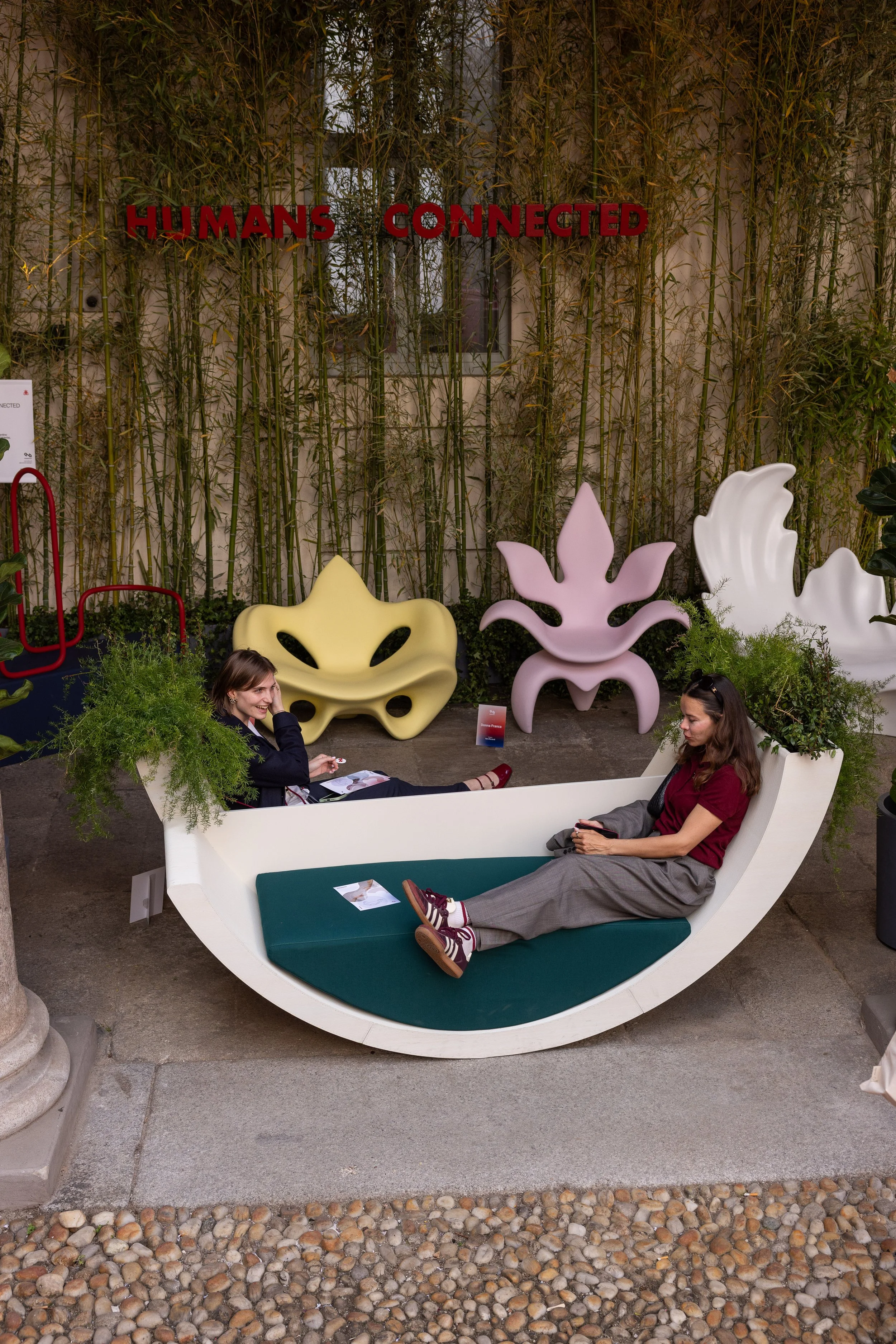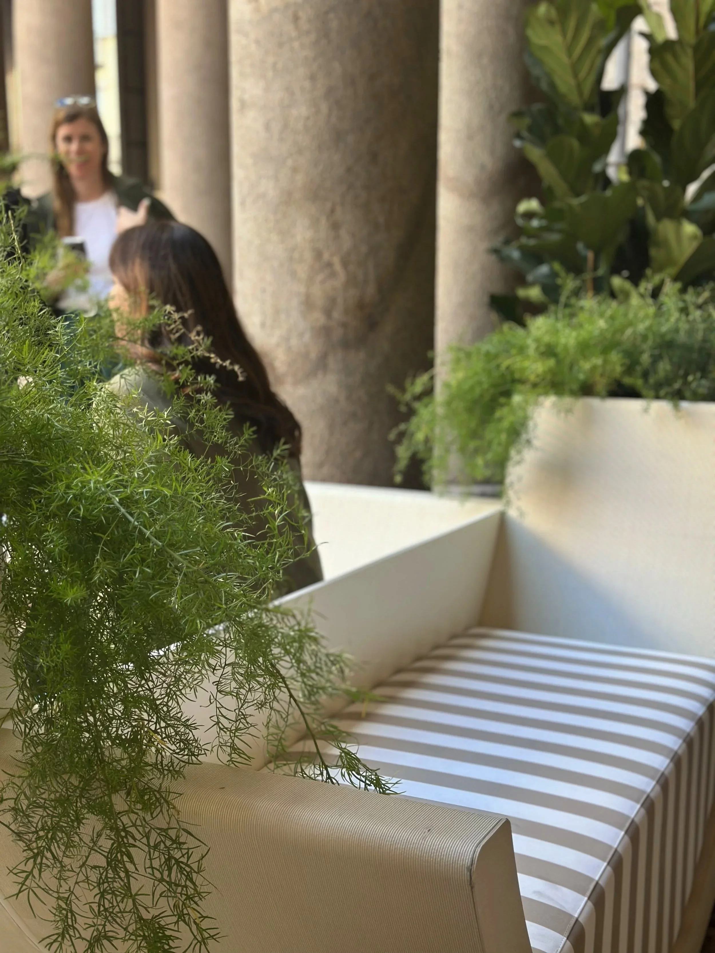 E poi c'è il Duondolo, e qui qualcosa cambia. La forma a culla rovesciata in beige, con il cuscino a righe verdi e i due fioriere laterali che incorniciano lo spazio come braccia aperte, è l'unico pezzo della collezione in cui la funzione non compete con la poetica ma la genera, in cui sedersi diventa un atto condiviso per definizione, perché la geometria curva non lascia spazio alla solitudine. Il Duondolo non è una seduta, è una proposta sociale: dice che stare insieme richiede un'architettura intenzionale, che il comfort collettivo si progetta e non si improvvisa, e lo dice con una leggerezza formale che è la cosa più difficile da ottenere nel design contemporaneo.