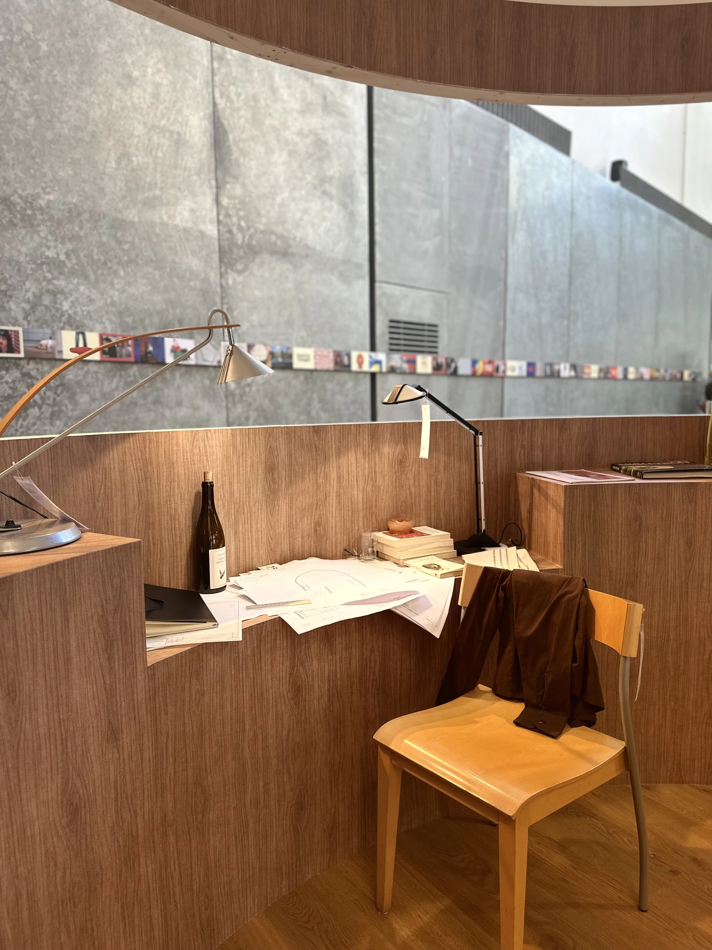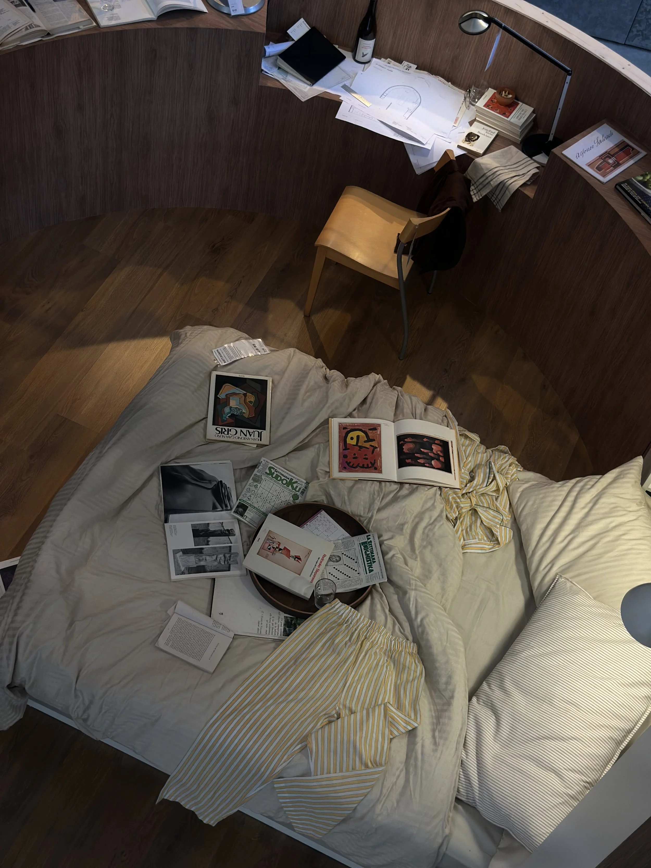 Taylor risponde con una stanza a forma di ciotola, rivestita in legno scuro, con una scrivania continua che percorre l'intera curva perimetrale e che diventa tavolo da pranzo con un gesto minimo, senza meccanismi dichiarati. Il piatto scelto da Lippett, tortellini in brodo con pasta tirata a mano e brodo chiarificato con albume d'uovo, segue la stessa logica: richiede ore, richiede attenzione, trasforma il momento del cibo in qualcosa di deliberato. Il tempo non è un costo ma una scelta, e lo spazio diventa il contenitore fisico di quella scelta.